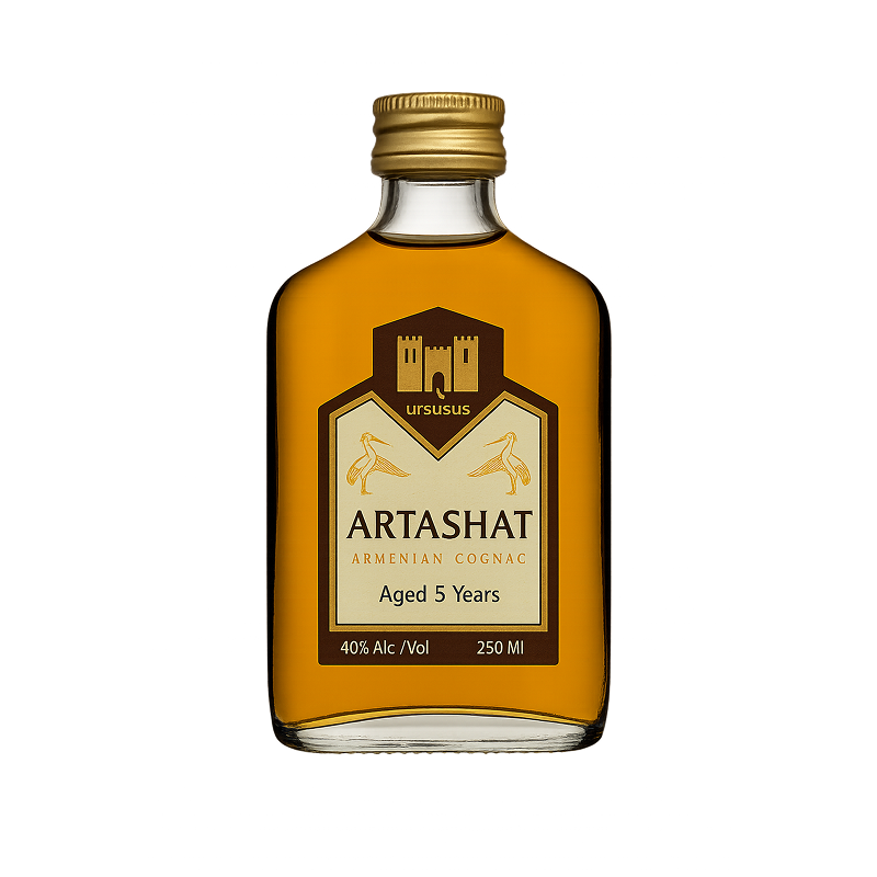 Արտաշատ 5 տարի0.5 literԻնչպես և վայել է արքային, սա բարձրակարգ ըմպելիք է, որը մարմնավորում է արևոտ Հայաստանի սրտի՝ Արարատյան դաշտի յուրահատուկ հմայքը:Կոնյակագործների բազմամյա փորձն ու նորագույն մեթոդները արտահայտված են 20 տարեկանից ավելի հնեցմամբ 15 տեսակի սպիրտներից պատրաստված բարձրակարգ հայկական կոնյակում: