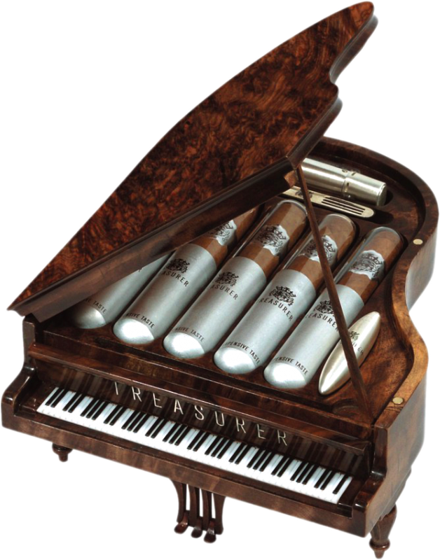 tion burl walnut Piano for 5 tubed cigars, with sterling silver inlay, silver humidifier, accompanied by a stylis